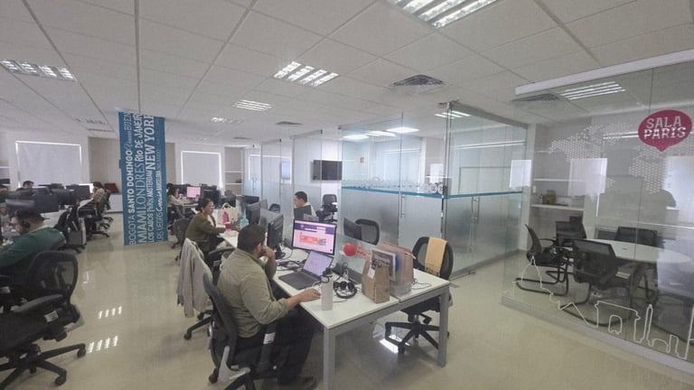 Alcances: Muros de cristal templado, habilitación de módulos de call center, herrería, colocación de mármol escaleras, instalación de deck, aires acondicionados, piso epóxico, mesetas de granito, carpintería.